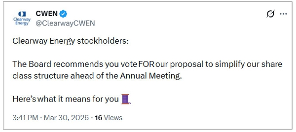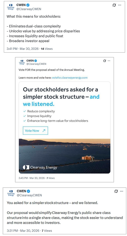 Also on March 30, 2026, the Company posted the following messages on its X account (@ClearwayCWEN).